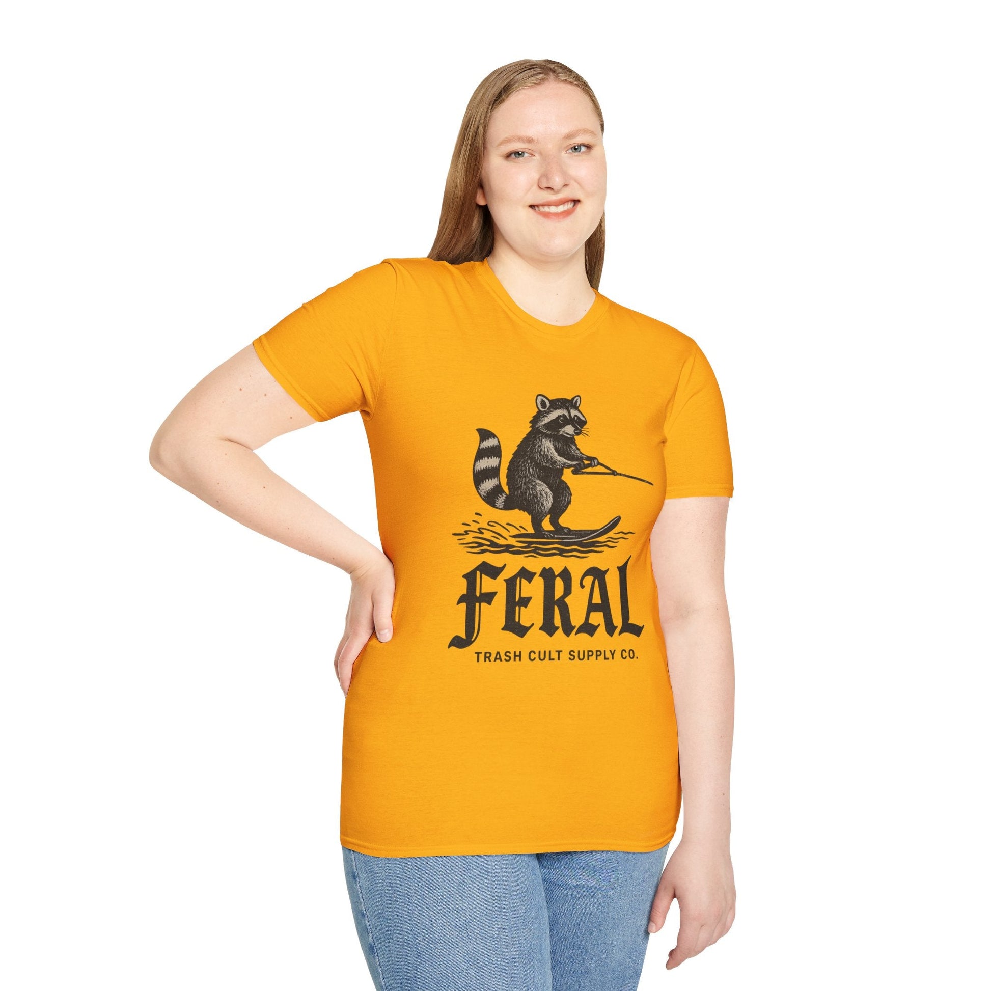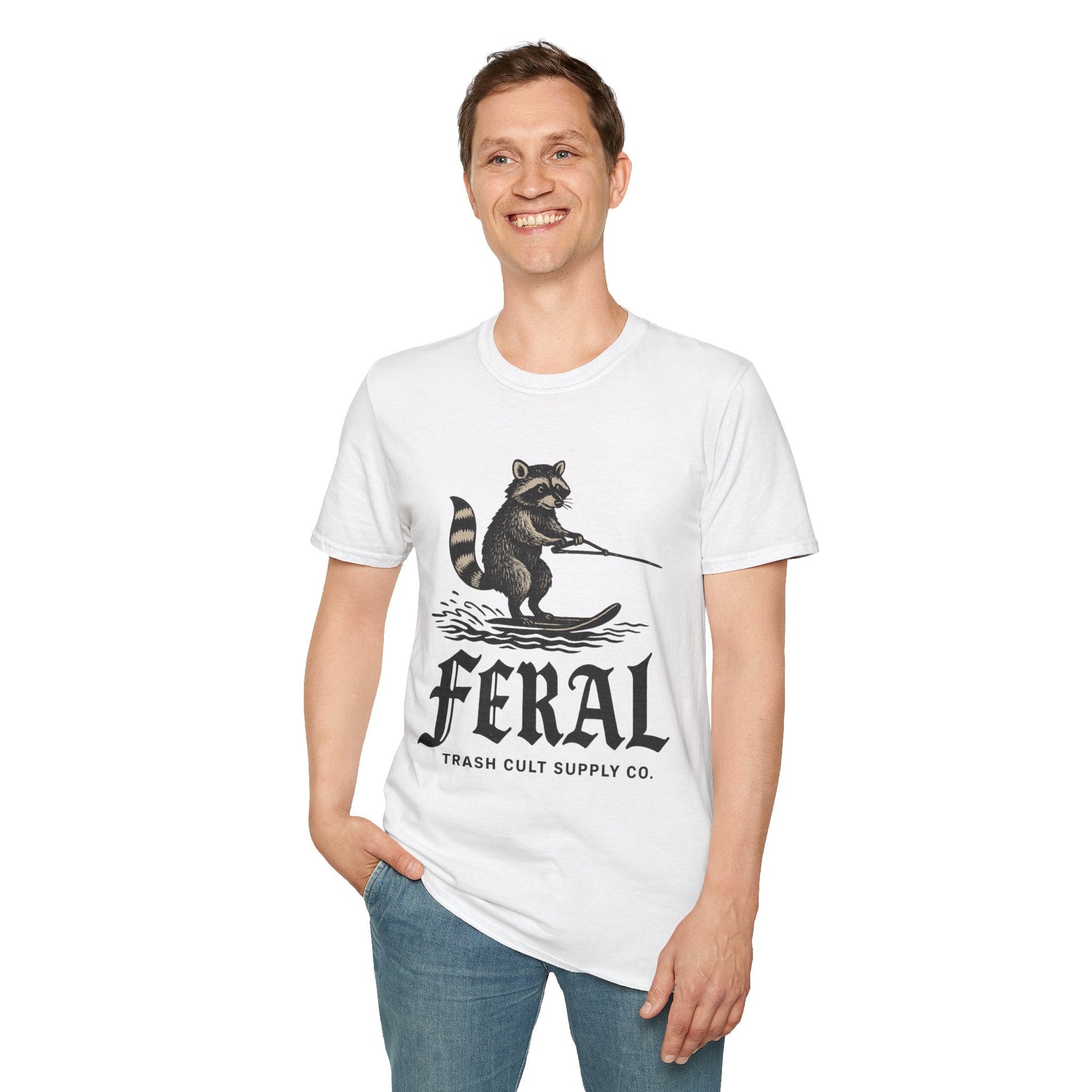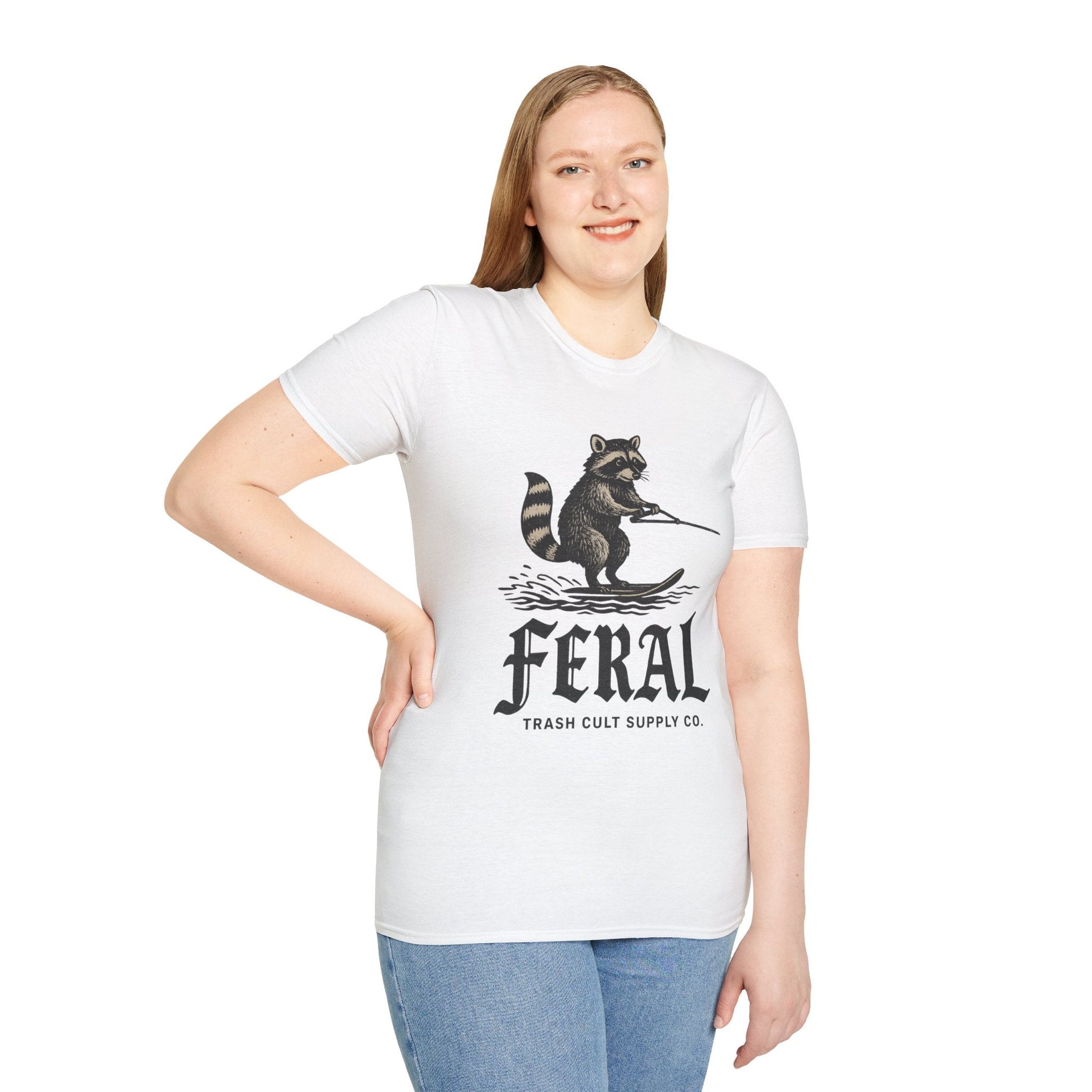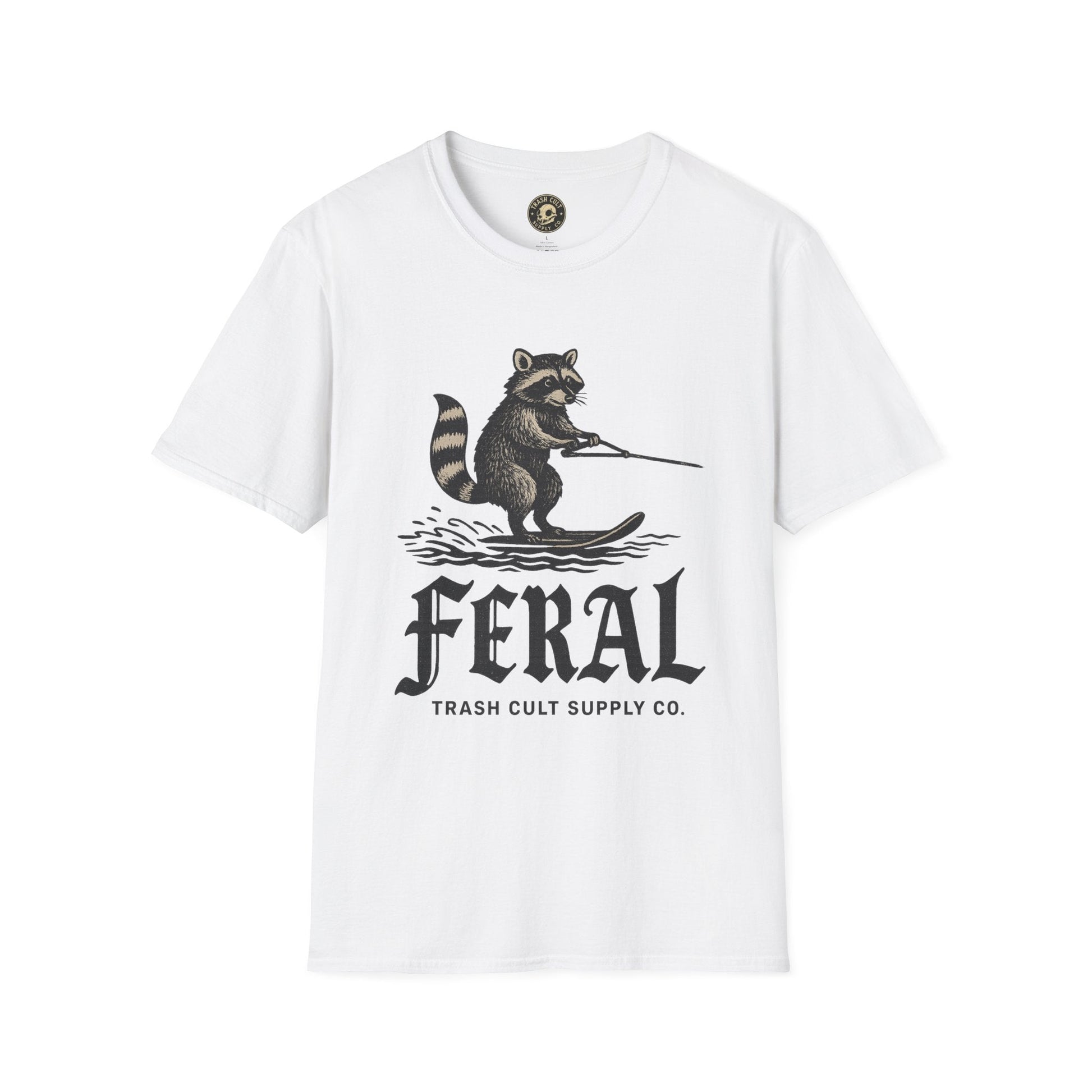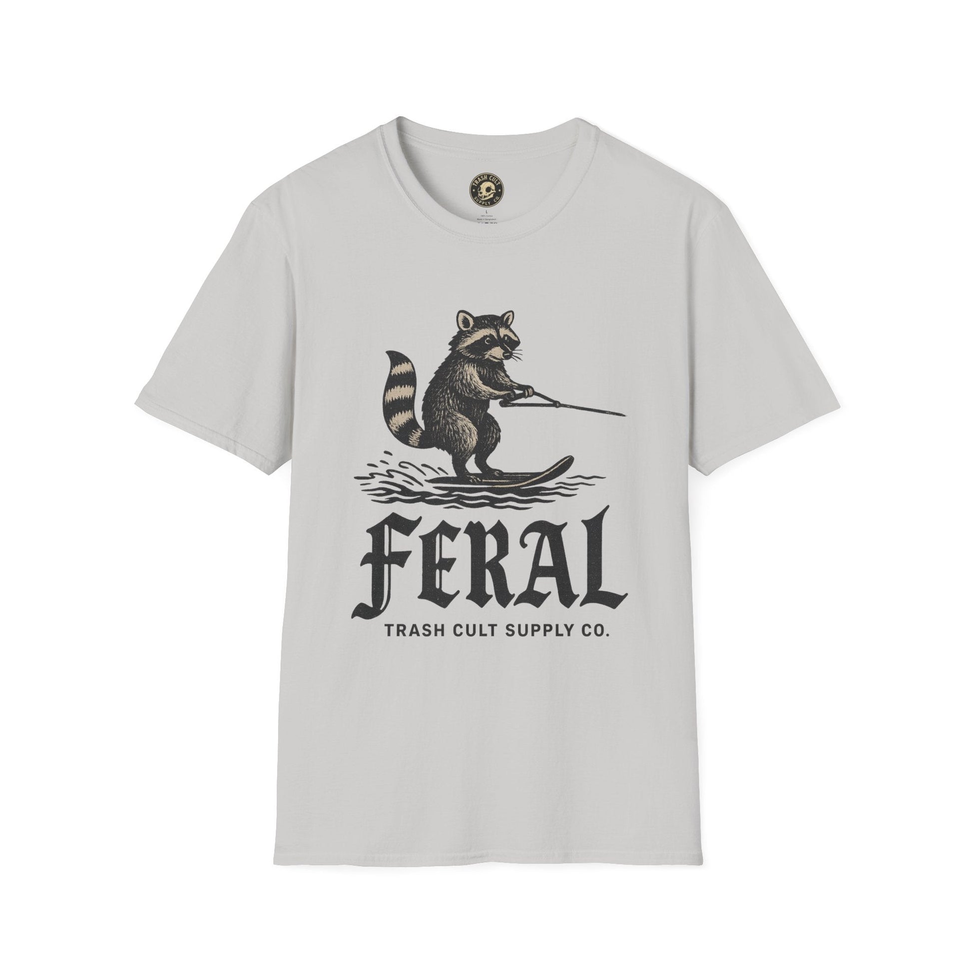 Unleash chaos in style with this vintage-inspired raccoon water skiing tee from Trash Cult Supply Co. Featuring distressed gothic "FERAL" lettering and a cracked texture design, this print-ready graphic pops on any color. Printed on a soft, high-quality Gildan 2000 Softstyle shirt for comfort and durability. Perfect for weirdos, rebels, and feral friends alike.
