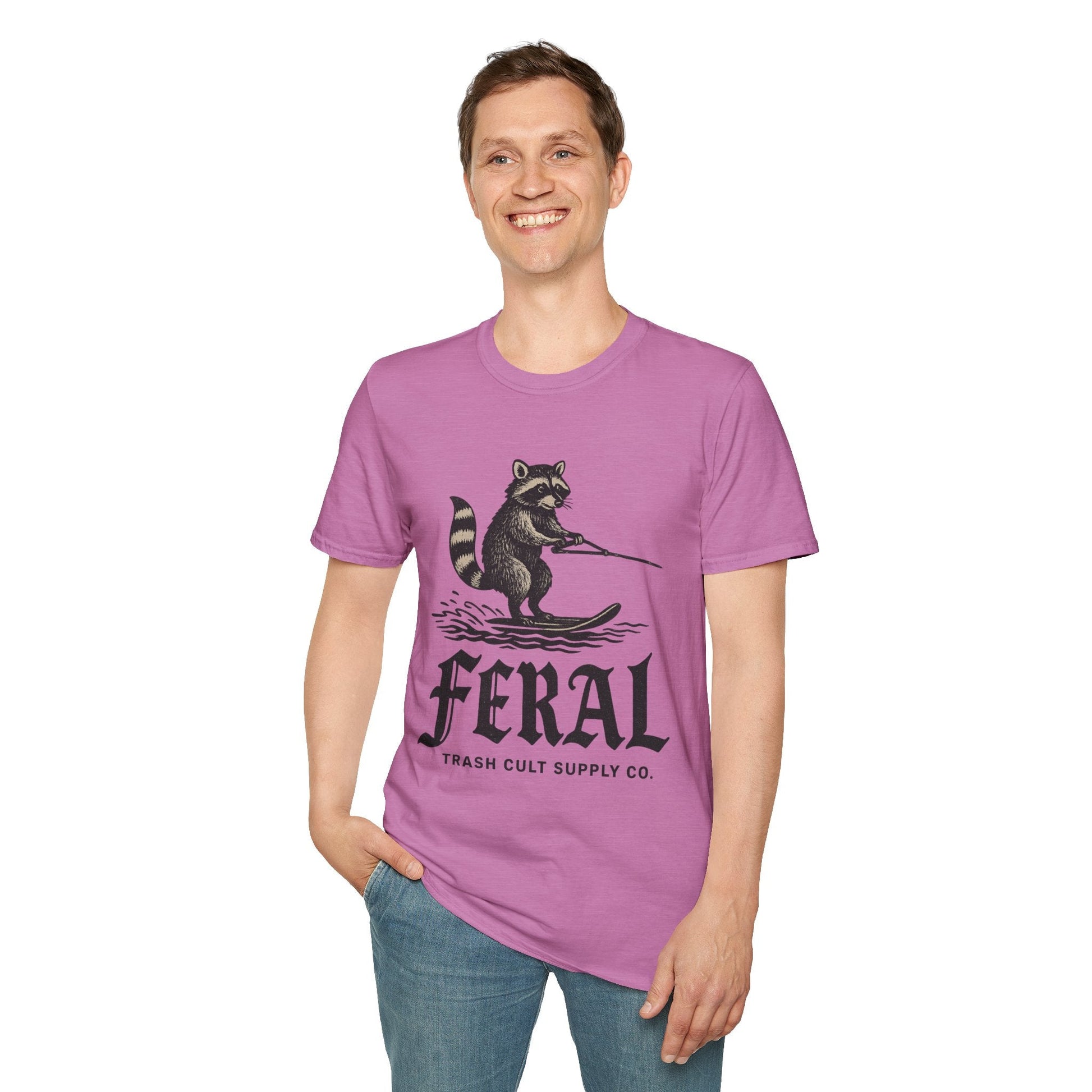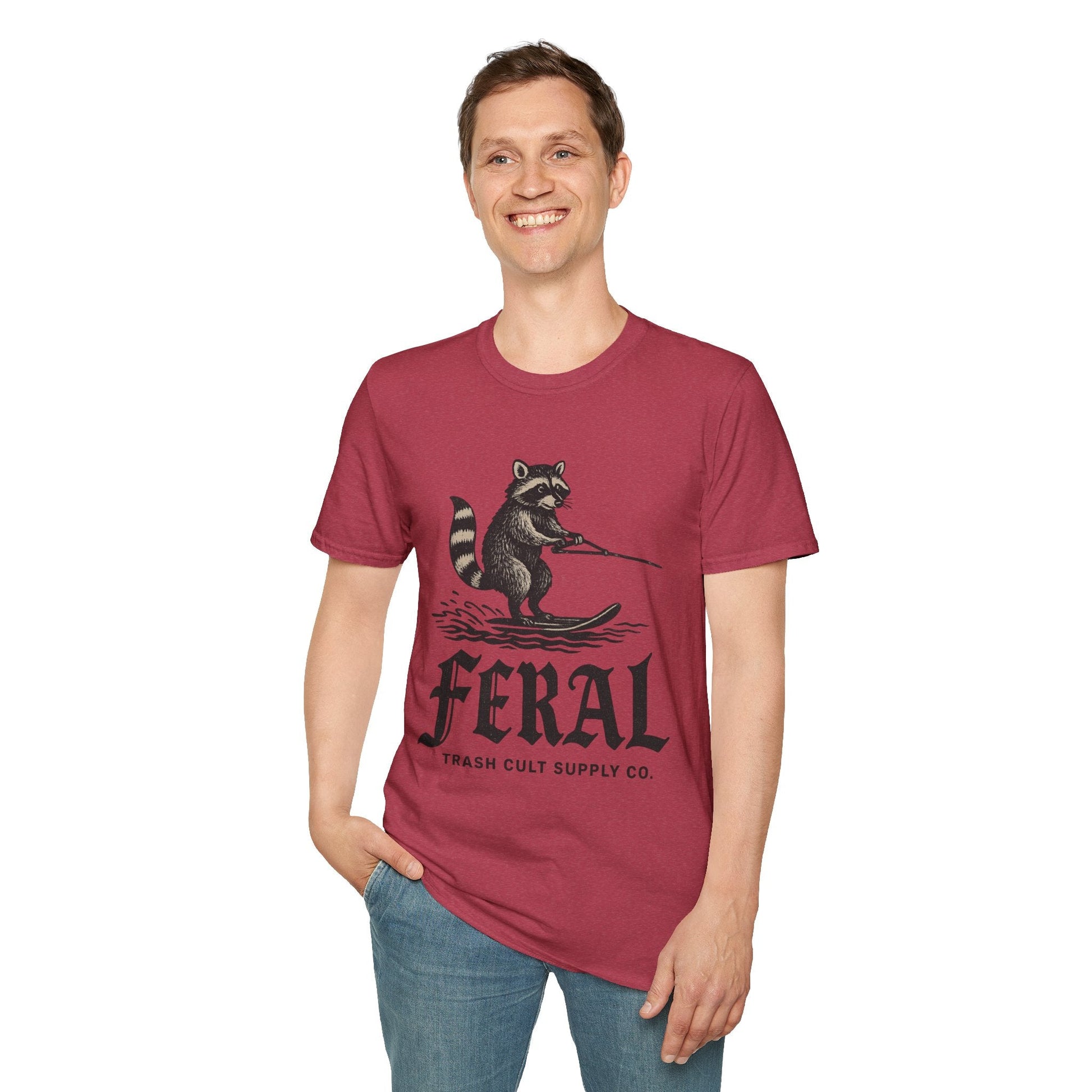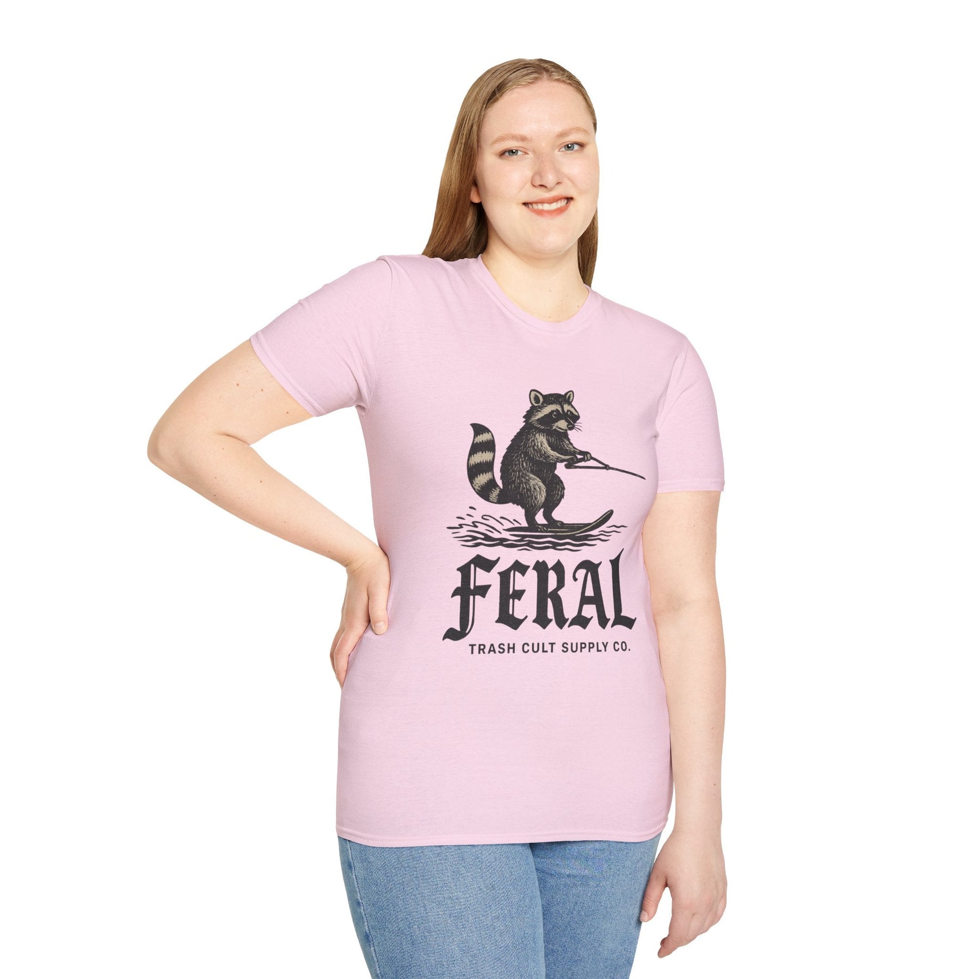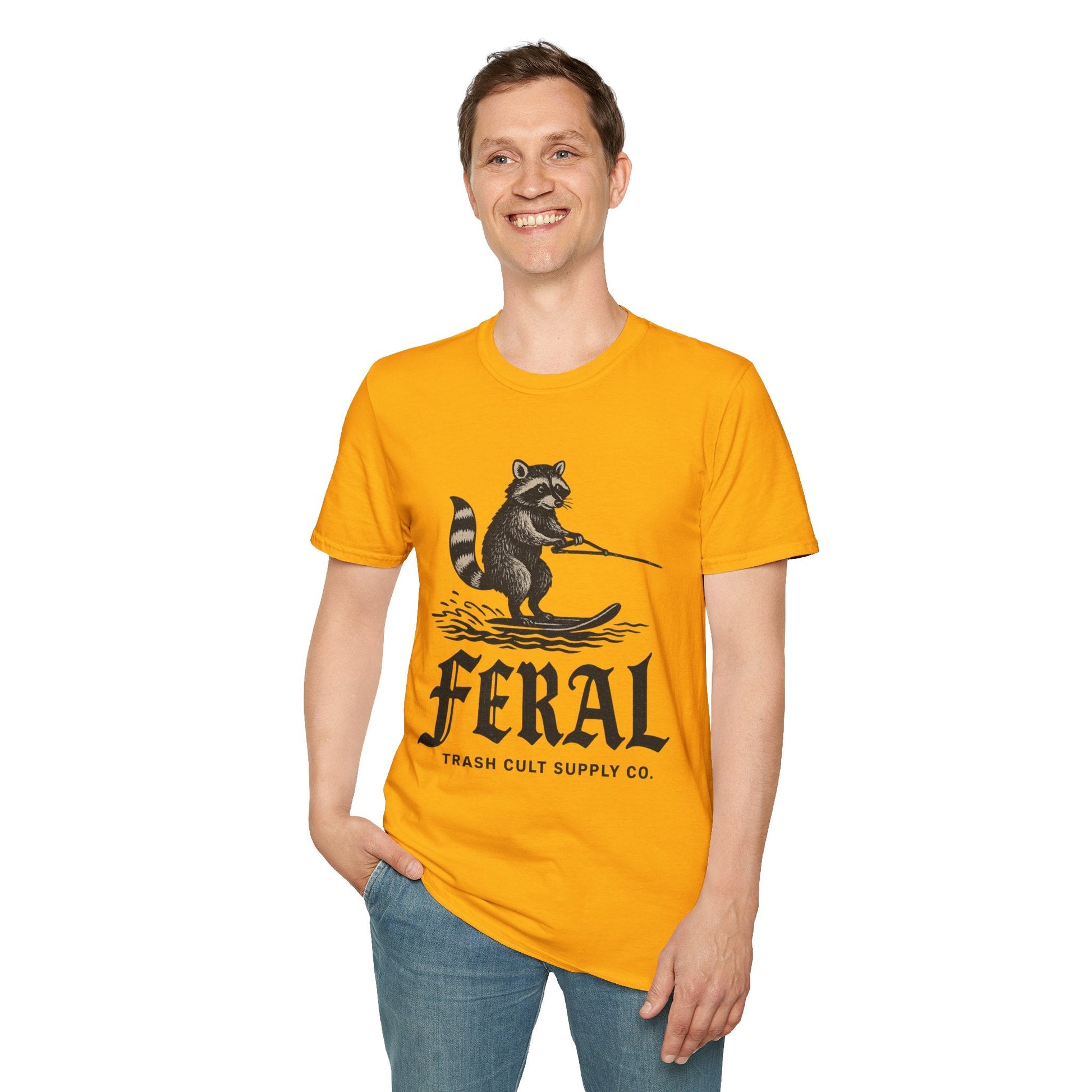 Unleash chaos in style with this vintage-inspired raccoon water skiing tee from Trash Cult Supply Co. Featuring distressed gothic "FERAL" lettering and a cracked texture design, this print-ready graphic pops on any color. Printed on a soft, high-quality Gildan 2000 Softstyle shirt for comfort and durability. Perfect for weirdos, rebels, and feral friends alike.