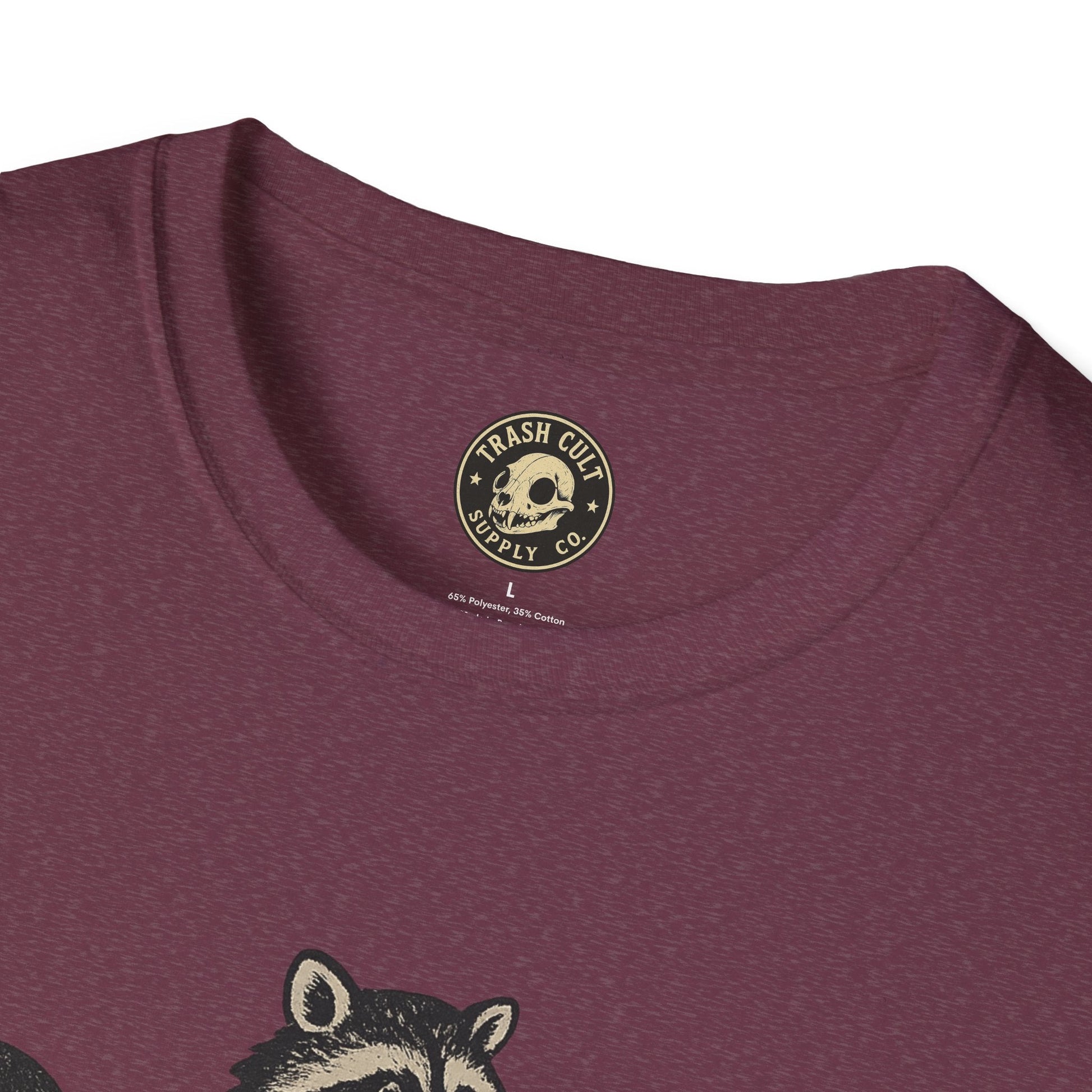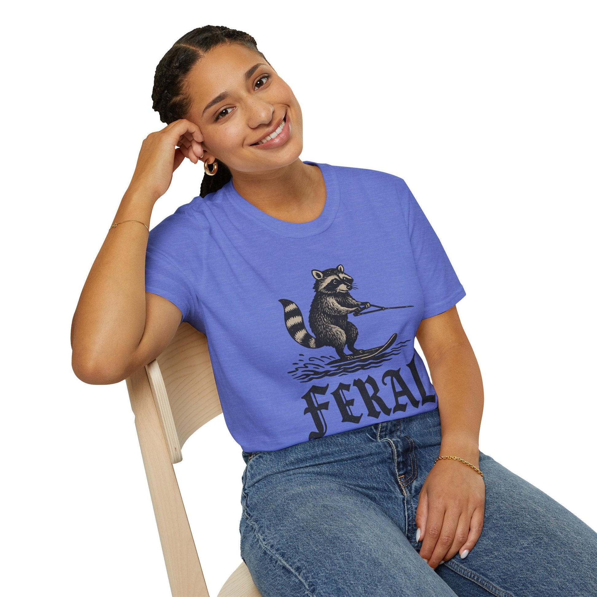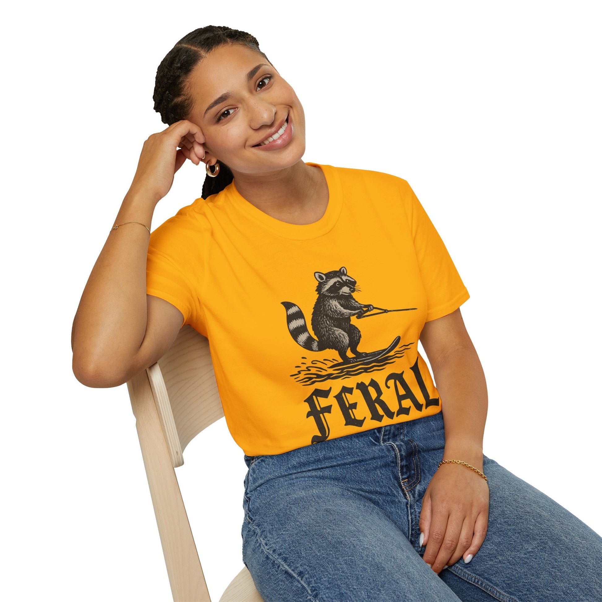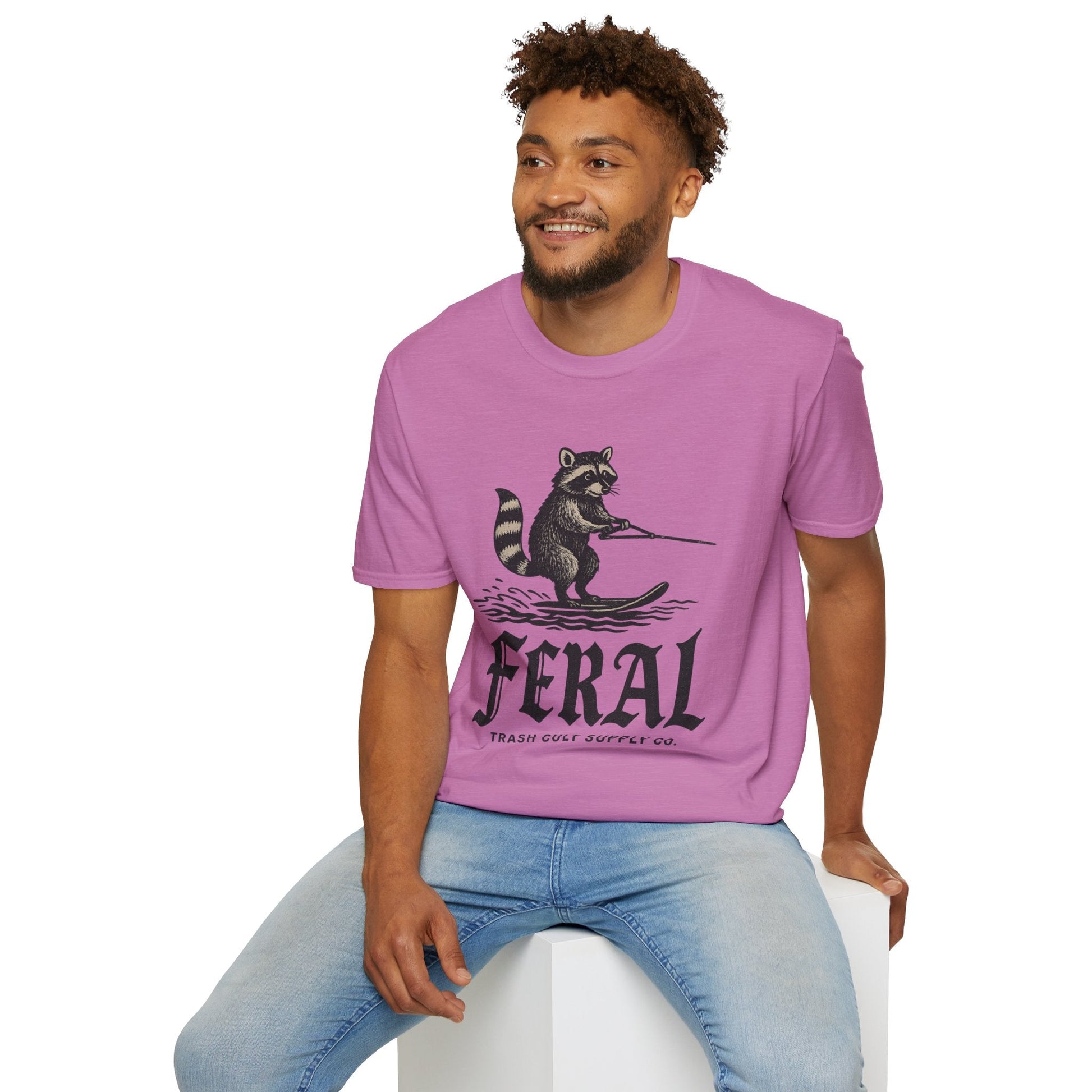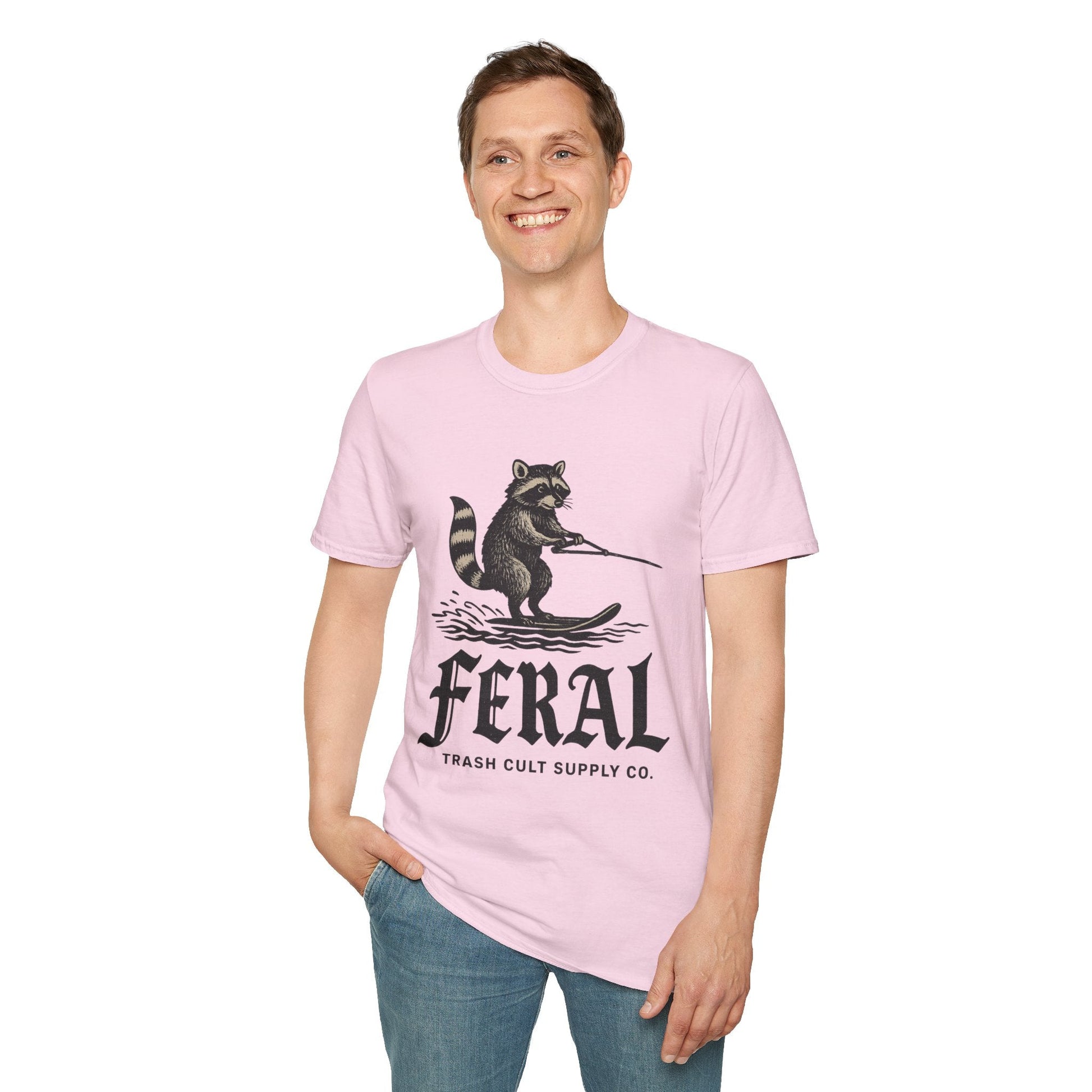 Unleash chaos in style with this vintage-inspired raccoon water skiing tee from Trash Cult Supply Co. Featuring distressed gothic "FERAL" lettering and a cracked texture design, this print-ready graphic pops on any color. Printed on a soft, high-quality Gildan 2000 Softstyle shirt for comfort and durability. Perfect for weirdos, rebels, and feral friends alike.